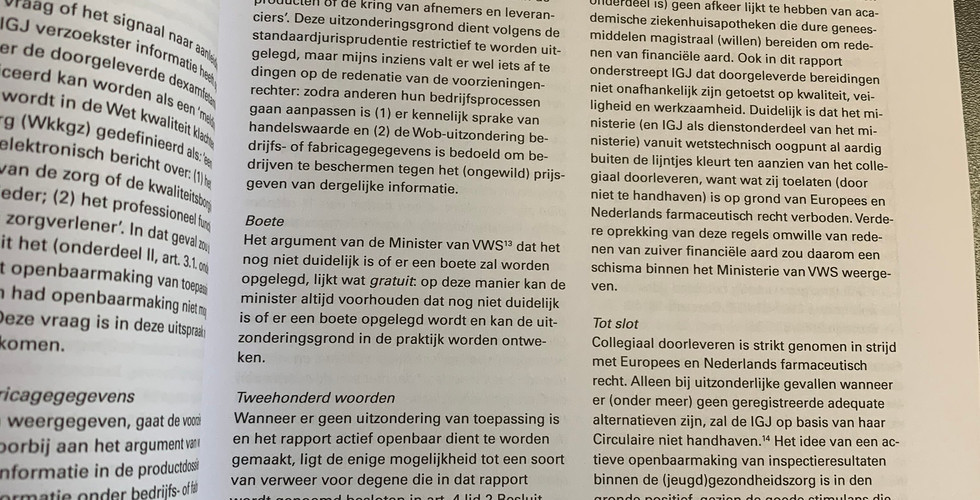 The inspection report pertained to collegial delivery (‘collegiaal doorleveren'), a much debated topic. Somewhat surprisingly, the District Court of Rotterdam ignores the argument that the information in the product dossiers and the product information should fall under the exception of business confidentiality and that it concerns trade secrets whereby the disclosure should be restricted.